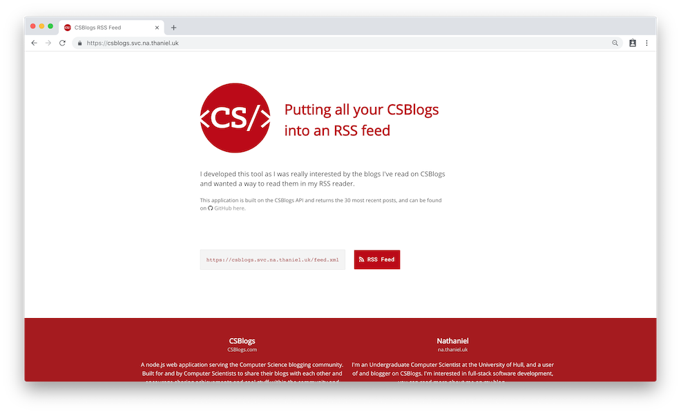 CSBlogs has a really good API, all nicely available and well documented online, I wrote a Node.JS application that pulls the most recent posts from the API, parses them into RSS and then serves the RSS feed back to users when it’s requested. I made a nice web frontend for it too, which can be seen in the image.