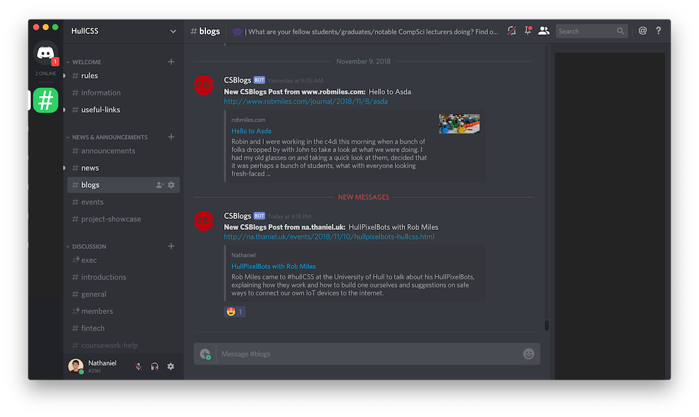 I wanted to read the content from the blog in my RSS reader, but I also wanted to show this in the #hullCSS discord blogs channel to cross-promote people’s blogs to our members. The previous system involved manually added members feeds as requested to the channel, but moving to using CSBlogs makes this easier as bloggers only have to get their blogs approved by CSBlogs to appear in our Discord too.
